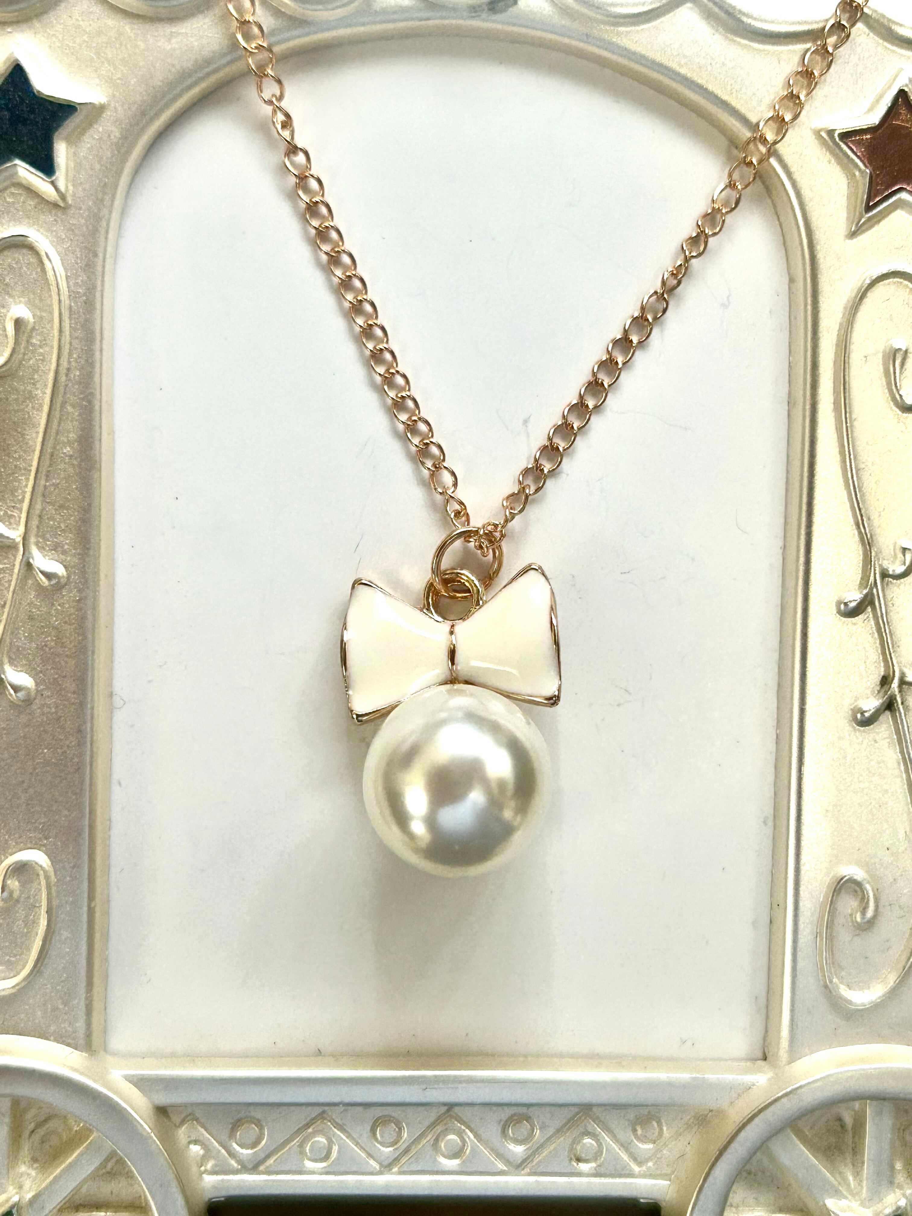 こちらのペンダントは、リボンモチーフと真珠風のエレガントなデザインが特徴的なアイテムです。ホワイトとゴールドの美しいコントラストが、あなたのスタイルに特別な輝きを添えてくれることでしょう。